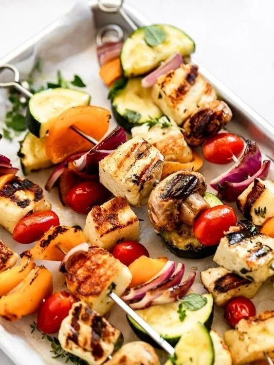 Thread the vegetables onto skewers, being careful not to overcrowd. Place skewers on prepared baking trays and roast for 15-20 minutes or until vegetables and haloumi are charred and softened. Turn skewers halfway through the cooking time. Set aside to cool.